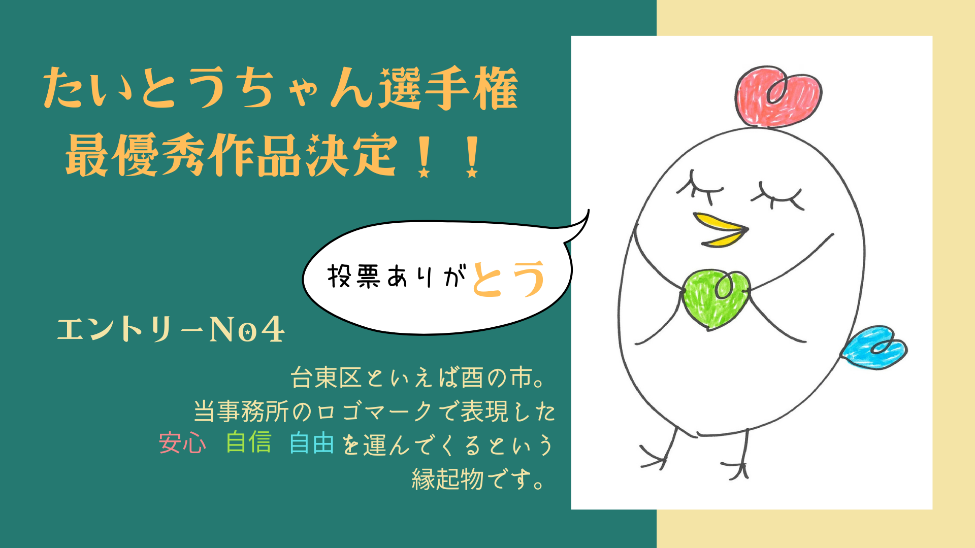 当事務所の設立5周年を記念して,マスコットキャラクター「たいとうちゃん」を所員から募集し,厳選した5つの候補作品の中から当事務所に縁のある方々に投票していただきました。