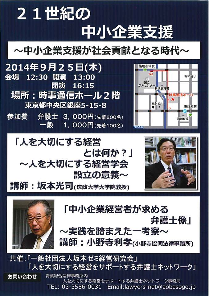 この小野寺弁護士のもう一つの顔である中小企業経営者を支えてきた実践を坂本教授のお話と共に、お聞きし、これからの企業法務のあり方を考えるセミナーとしたいと思っております。